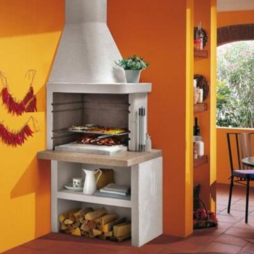 Барбекю Aleria 2 для сада, выполненное из бетона, со столешницей из морозостойкого клинкера. Угловая реверсивная модель с металлической вставкой в духовке и хромированной решеткой для гриля 63х40 см, устанавливаемой на одном из двух возможных уровней.
