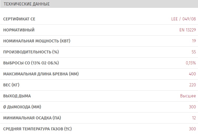 Производительность этого камина впечатляет: с тепловой мощностью 19 кВт он способен обогревать помещение до 190 м², создавая комфортную атмосферу в вашем доме.