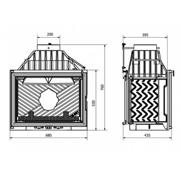 Регулировка шиберной заслонки позволяет контролировать интенсивность процесса горения. Блокиратор каминной дверцы ограничивает её открытие при закрытом положении шибера, что исключает возможность попадания дымовых газов в помещение.